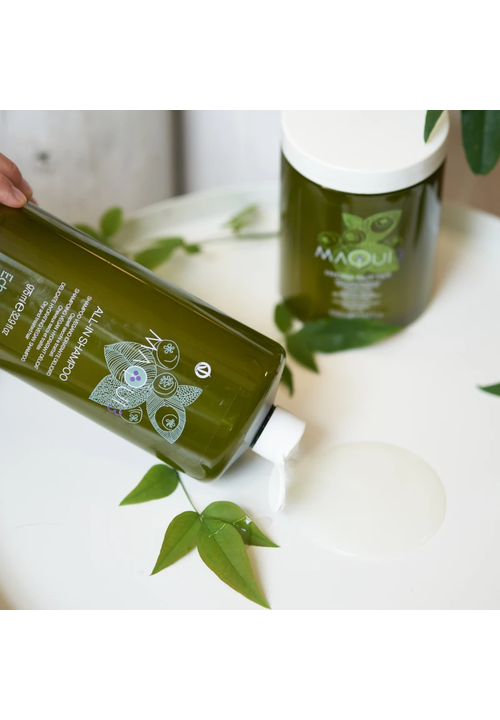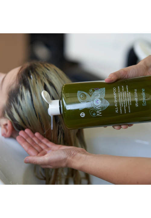 Шампунь All-In ніжно очищає та зволожує волосся завдяки екстракту макі, багатому на антиоксиданти.