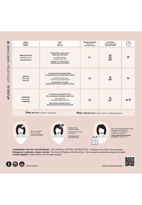 Нанесіть барвник на волосся. Залишіть на 10 хвилин. Семульгуйте суміш із водою і ретельно змийте. Завершіть процедуру найбільш доречним доглядом Alter Ego Italy
