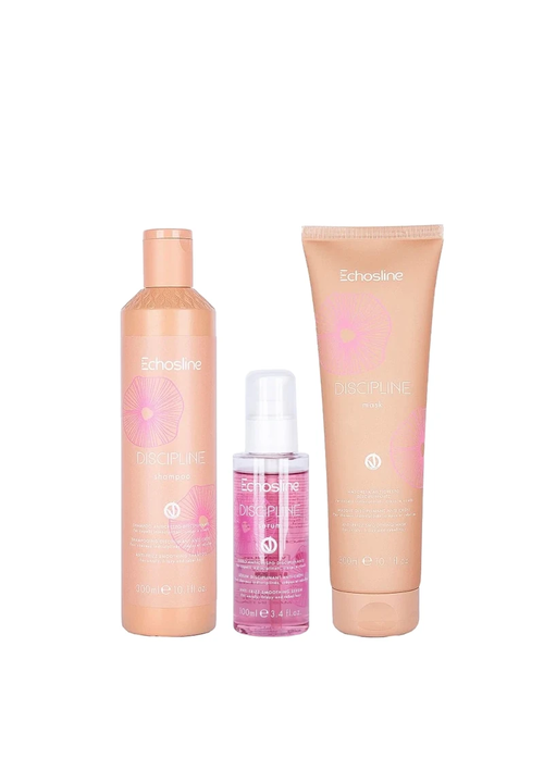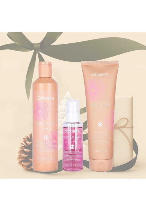 Набір Echosline Discipline поєднує три високоефективні засоби догляду – шампунь (300 мл), маску (300 мл) та флюїд (100 мл) – і пропонує цілеспрямоване рішення для неслухняного, кучерявого та неслухняного волосся. Багаті формули з лляною олією, аргановою олією, маслом какао та маслом ши забезпечують інтенсивне зволоження, приборкують пухнастість та надають волоссю помітної гладкості та шовковистого блиску.