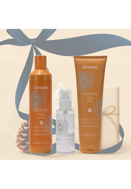 Набір Echosline Keratin Veg Kit поєднує три потужні продукти – шампунь (300 мл), маску (300 мл) та флюїд (100 мл) – для інтенсивного, комплексного догляду за пошкодженим, хімічно обробленим або стресованим волоссям. Багаті формули з аргановою олією, росли