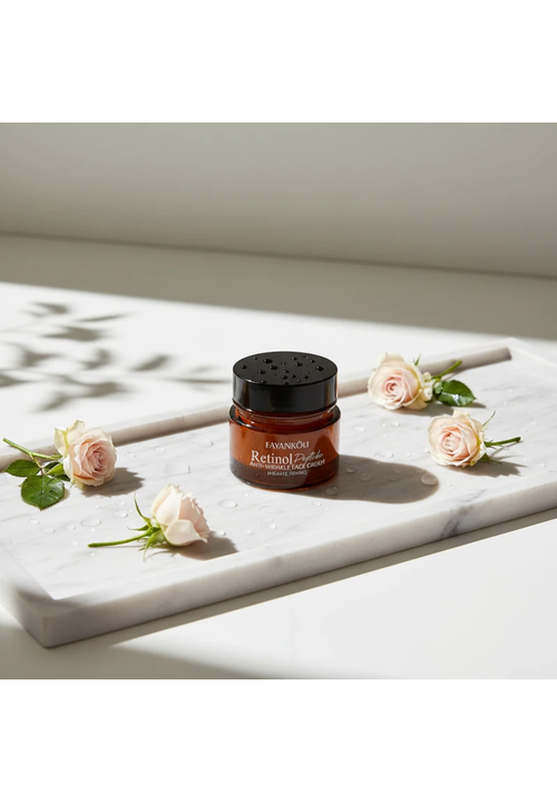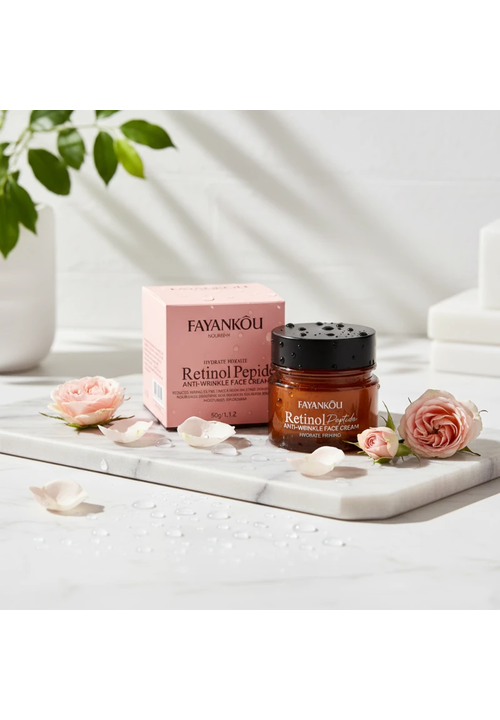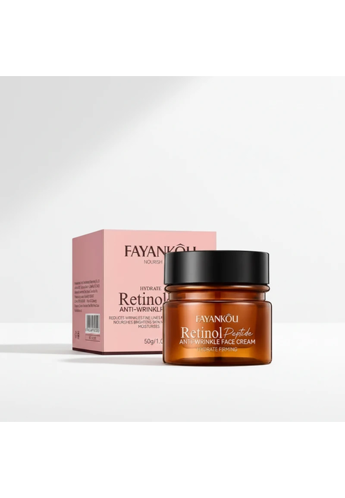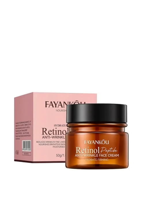 Fayankou Retinol Крем для обличчя проти зморшок антивіковий з Ретинолом та Пептидами, 50 мл Омолоджувальний крем-розгладження для шкіри обличчя з Пептидним комплексом, Ретинолом, Гіалуроновою кислотою, ферментами Біфідобактерій та Рослинними екстрактами допомагає шкірі протистояти віковим змінам і довше залишатися еластичною та пружною. Комплекс 6 пептидів прискорює синтез власного колагену і еластину, покращує мікроциркуляцію, сприяє розгладжуванню зморшок, підвищує тонус і щільність шкіри та надає ліфтинг-ефект. Ретинол сприяє вирівнюванню тону і рельєфу шкіри, прискореному процесу регенерації клітин, звуженню пор, поліпшенню кольору обличчя. Ретинол впливає на глибокі шари шкіри і завдяки своїм регенеруючим властивостям ефективно зменшує шорсткість і сухість шкіри, робить її шовковистою та м'якою на дотик. При регулярному використанні цього антивікового крему шкіра стає більш молодою, підтягнутою та гладкою. Підходить для всіх типів шкіри. Спосіб використання: Вранці та ввечері легкими поплескуючими рухами рівномірно нанесіть крем на чисту шкіру обличчя та шиї.