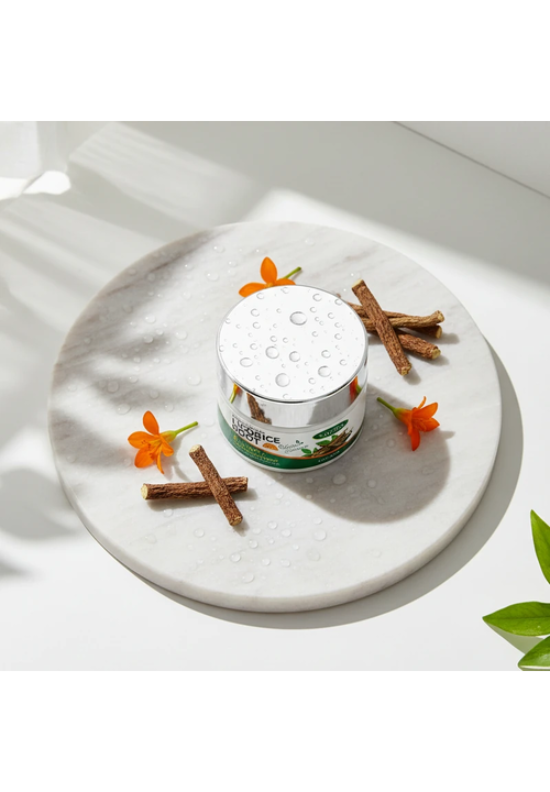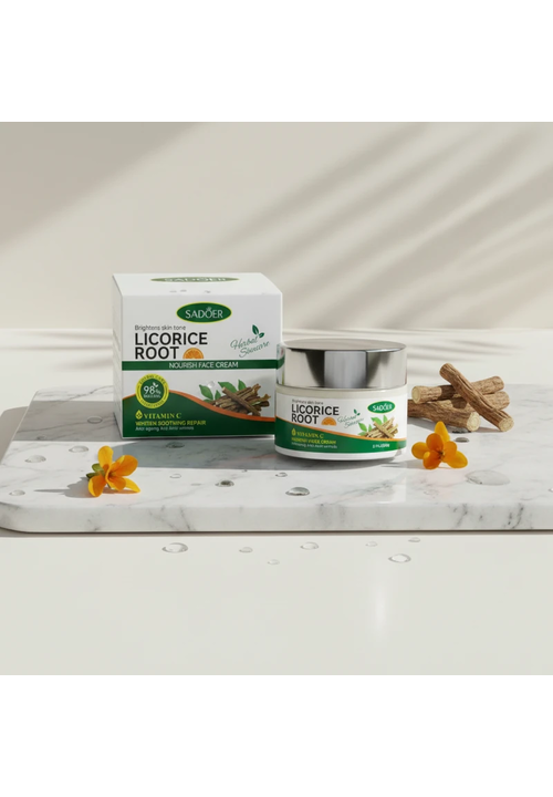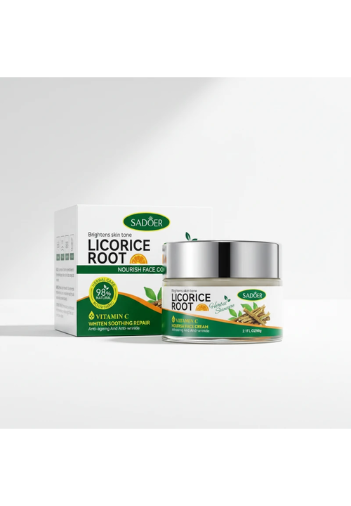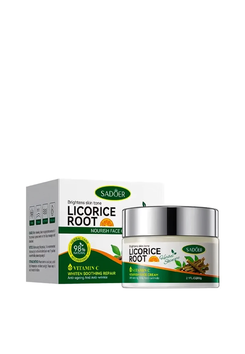 Sadoer Licorice Root Крем для обличчя живильний освітлюючий з Коренем лакриці та Вітаміном С, 60 мл Високоефективний протизапальний та заспокоюючий крем, що має спеціальну формулу, яка дозволяє оздоровити шкіру за короткий період часу. Містить: - Вітамін С - основний антиоксидант. Він допомагає виробляти колаген, що зберігає шкіру пружною та молодою, крім того, має потужні протизапальні властивості; - Корінь солодки (лакриці) дозволяє усунути надмірну пігментацію: висвітлює пігментні плями, веснянки, ластовиння, шрами, рубці, постакне. Також компоненти лакриці знімають запалення та зміцнюють судинні стінки, запобігаючи куперозу. Крем глибоко зволожує шкіру, заспокоює подразнення і тонізує, нейтралізує вільні радикали та забезпечує захист від інфекційних агентів, уповільнює старіння. Це ідеальний засіб для догляду за чутливою та проблемною шкірою Спосіб використання: Нанести крем на очищену суху шкіру обличчя, легенько вбити кінчиками пальців до повного вбирання.