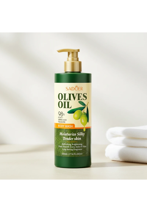 Sadoer Olives Oil Гель для душу зволожуючий та розгладжуючий з олією Оливи, 500 мл Розкішний гель для душу, збагачений 98% екстрактом Оливок, Амінокислотами, Скваланом і Пантенолом, а також екстрактом Канаріума білого, багатим на поживні жири та олії. Гель створює рясну піну, яка ефективно очищує шкіру тіла, пом'якшує і зволожує, розгладжує рельєф шкіри, додає тілу ніжний аромат. Спосіб використання: Нанесіть гель на вологу шкіру, м'яко помасажуйте круговими рухами, потім ретельно змийте теплою водою. Підходить для щоденного використання і для будь-якого типу шкіри.
