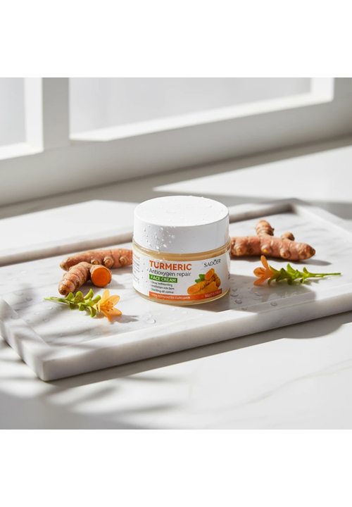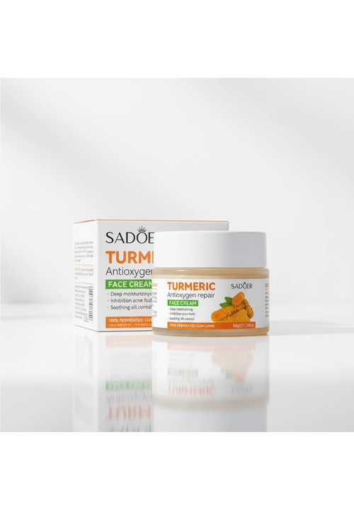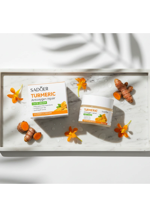 Sadoer Turmeric Крем для обличчя відновлюючий з Куркумою та Антиоксидантами, 50 мл Спеціальний відновлюючий засіб з антиоксидантними властивостями Куркуми, призначений для боротьби з акне, пігментними плямами, постакне та зморшками. Ідеально підходить для догляду за жирною, схильною до акне та комбінованою шкірою. Окрім Куркуми крем містить Гіалуронову кислоту, Аргінін, Алантоїн і Вітамін Е. Така формула глибоко зволожує, стимулює регенерацію тканин, розгладжує рубці та шрами від акне, вирівнює тон та мікрорельєф шкіри, звужує пори і усуває жирний блиск. А також крем блокує вільні радикали, сповільнюючи старіння шкіри, покращує колір обличя і надає йому свіжого, відпочилого вигляду. Спосіб використання: Нанести необхідну кількість крему на шкіру і розподілити масажними рухами, уникаючи шкіри навколо очей. Для найкращого результату рекомендується використовувати разом з іншими засобами цієї серії.