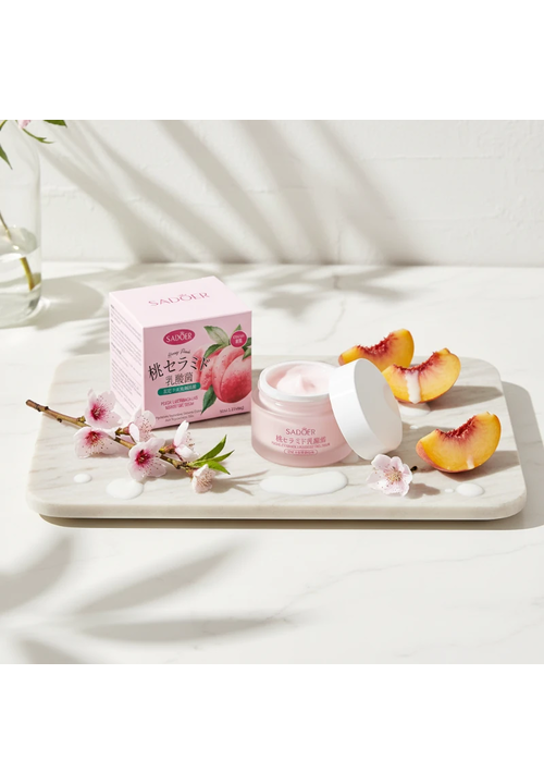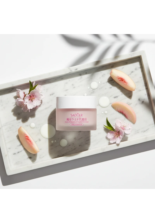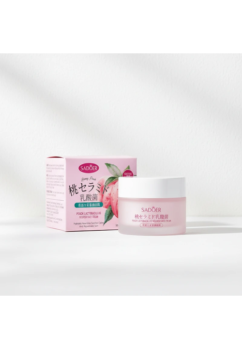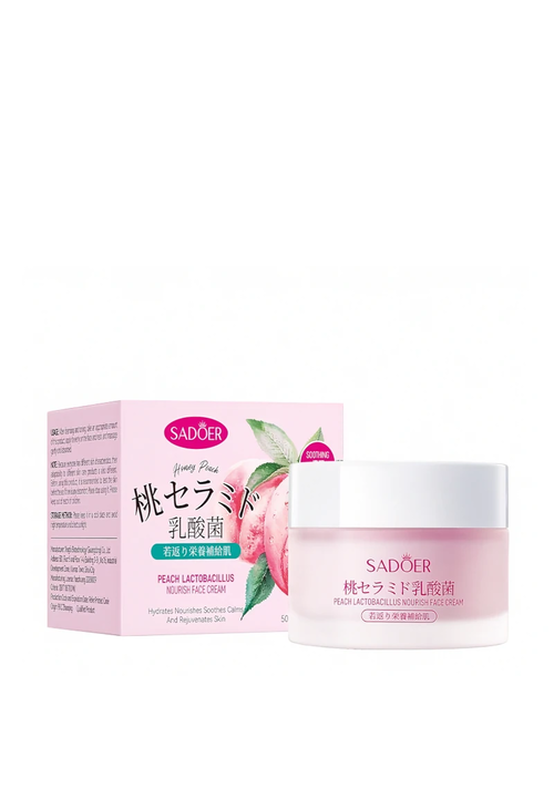 Sadoer Крем для обличчя поживний і відновлюючий з Персиком та Лактобактеріями, 50 мл Суперпоживний крем, що містить екстракти Персику і Нектарину, Лактобактерії, Гідролізований колаген, Гіалуронову кислоту, Кераміди, Алантоїн і Ніацинамід. - Екстракт Персику делікатно відлущує відмерлі клітини епідерміса, вирівнює тон та текстуру шкіри, покращує бар'єрні функції, звужує розширені пори, зменшує тьмяність шкіри, надає здорвий колір та сяяння; - Лактобактерії відновлюють щільність тканин, зменшують провисання шкіри, роблять контур обличчя чітким і підтягнутим. Також захищають шкіру від негативних факторів довкілля, виводят токсини і знижують дію вільних радикалів. Така насичена формула забезпечує тривале зволоження, покращує метаболізм, відновлює і регенерує шкіру, підвищує еластичність і пружність шкіри, зменшує зморшки, заспокоює запалення і подразнення, регулює ліпідний баланс в шкірі. Крем забезпечує швидке вбирання та глибоке проникнення в дерму. Спосіб використання: Нанести крем на очищену та тонізовану шкіру обличчя, легенько вбити кінчиками пальців до повного вбирання.